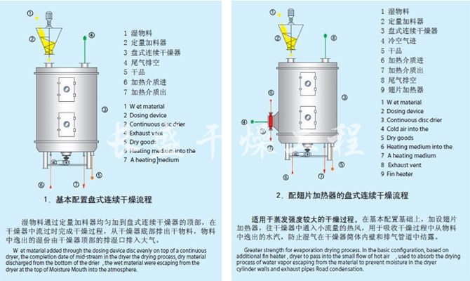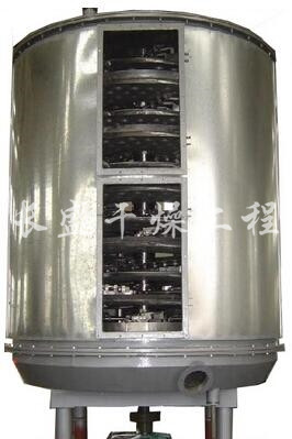 湿物料自加料器连续地加到干燥器上部第一层干燥盘上,带有耙叶的耙臂作回转运动使耙臂作回转运动使耙叶连续地翻抄物料。物料沿指数螺旋线流过干燥盘表面,在小干燥盘上的物料被移送到外缘,并在外缘落到下方的大干燥盘外缘,在大干盘上物料向里移动并从中间落料口落如下一层小干燥盘中。大小干燥盘上下交替排列,物料得以连续地流过整个干燥器。中空的干燥盘内通入加热介质,加热介质形式有饱和蒸汽、热水和导热油,加热介质由干燥盘的一端进入,从另一端导出。已干物料从最后一层干燥盘落到壳体的底层,最后被耙叶移送到出料口排出。湿份从物料中逸出,由设在顶盖上的排湿口排出,真空型盘式干燥器的湿气由设在顶盖上的真空泵口排出。从底层排出的干物料可直接包装。通过配加翅片加热器、溶剂回收冷凝器、袋式除尘器、干料返混机构、引风机等辅机,可提高其干燥的生产能力,干燥膏糊状和热敏性物 料,可方便地回收溶剂,并能进行热解和反应操作。