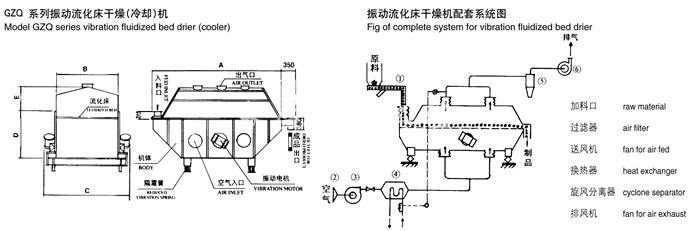 物料自进料进口进入机内,在振动力作用下,物料沿水平面流化床抛掷,向前连续运动,热风向上穿过流化床同湿物料换热后,湿空气经旋风分离器除尘后由排风1:3排出.干燥物料由排料进口排出。