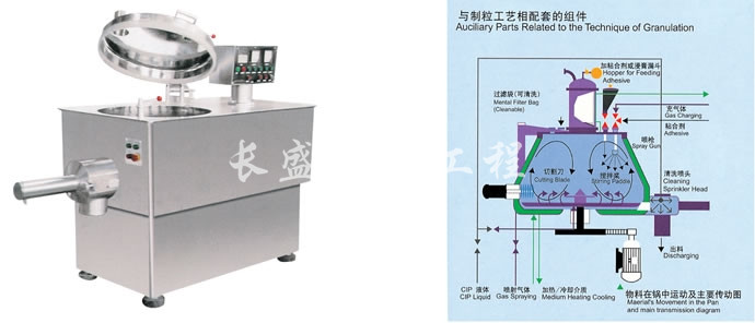 粉体物料与粘合剂在圆筒形容器中由底部混合浆充分混合成湿润软材,然后由侧置的高速粉碎桨切割成均匀的湿颗粒。