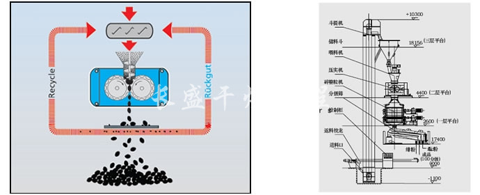 对辊式挤压造粒的工艺原理是:干物料在压力作用下团聚成致密坚硬的大块(饼料),称为挤压过程;饼料再被破碎筛分后成为颗粒料称为造粒过程。挤压的作用一是将颗粒间的空气挤掉,另外是使颗粒间距达到足够近,以产生如范德华力、吸附力、晶桥及内嵌连接等吸引力。挤压造粒的颗粒主要是靠分子之间的作用力形成的颗粒强度。