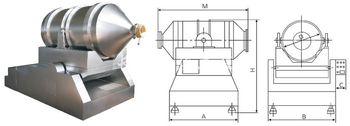 EYH二维混料机的转筒可同时进行二个运动,一个为转筒的转动,另一个为转筒随摆动架的摆动。被混合物料在转筒内随转筒转动、翻转、混合的同时,又随转筒的摆动而发生左右来回的掺混运动,在这两个运动的共同作用下,物料在短时间内得到充分的混合。EYH二维混料机适合所有粉、粒状物料的混合。