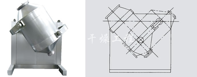 装料的筒体在主动轴的带动下,作周而复始的平移、转动和翻滚等复合运动,促使物料沿着筒体作三向复台运动,从而实现多种物料的互相流动、扩散、积聚、掺杂.以达到均匀混合的目的。