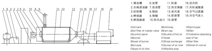 燃料通过燃烧器燃烧,产生高温燃气。并借助具有强化换热措施的热风炉将高温燃气的热量传导给被加热的空气,高温燃气经热量散发后温度降低至250℃后排到大气中。需加热的空气通过选配的鼓风机强送入热风炉,吸热后温度升至额定值从热风出口处送出,当热风温度达到额定温度上限时,燃烧器会自动停止燃烧或自动转为小火焰燃烧,当热风温度降低到额定下限温度时,燃烧器又会重新点燃运行或转为大火燃烧,升温的速度可以调节进风阀的开度来实现。