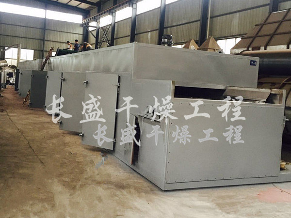 物料由加料器均匀地铺在网带上,网带一般采用12-60目不锈钢丝网,由传动装置拖动在干燥机内移动。干燥机由若干单元组成,每一单元热风独立循环,部分尾气由专门排湿风机排出,废气由调节阀控制,热气由下往上或由上往下穿过铺满物料的网带完成热量与质量传递的进程,带走物料水份。网带缓慢移动,运行速度可根据物料温度自由调节,干燥后的成品连续落入收料器中。上下循环单元根据用户需要可灵活配备,单元数量亦可根据需要选取。
